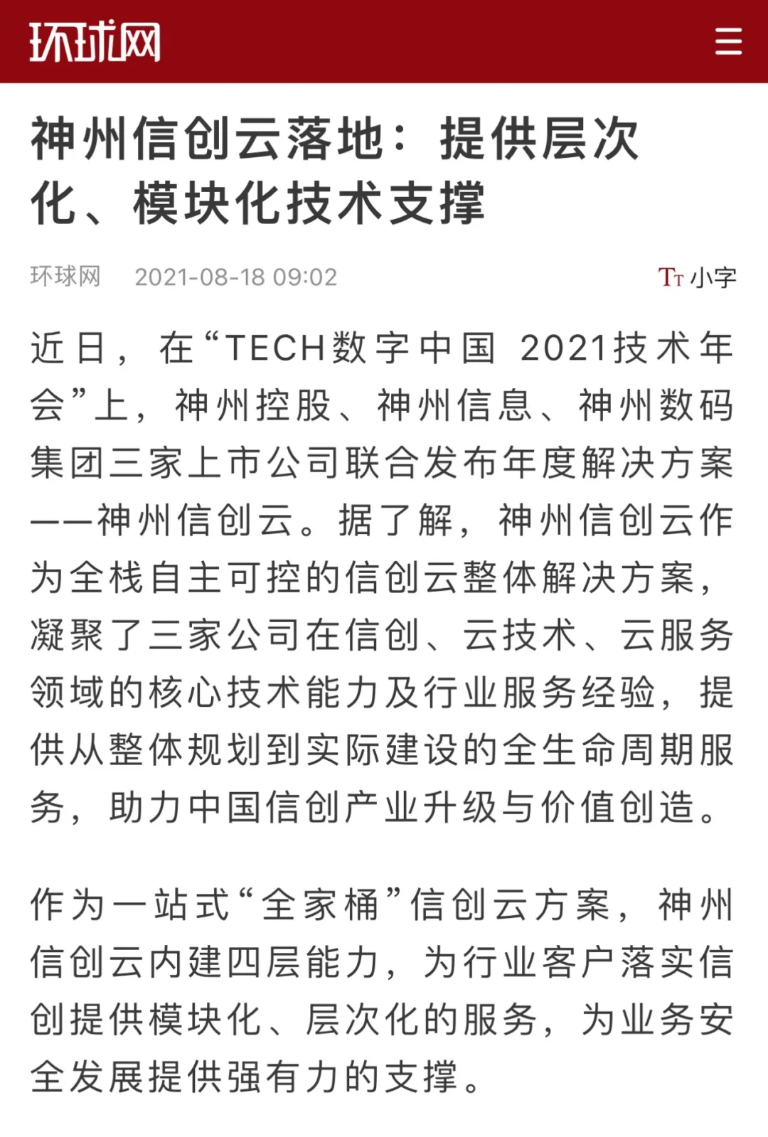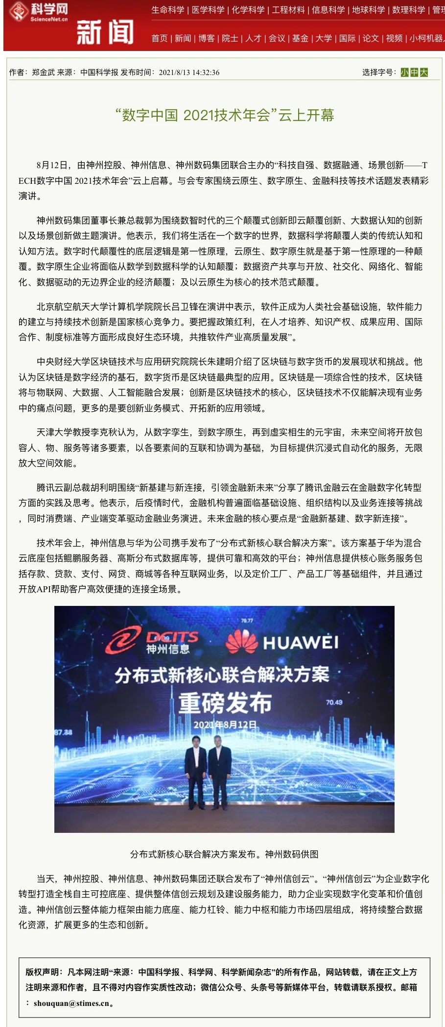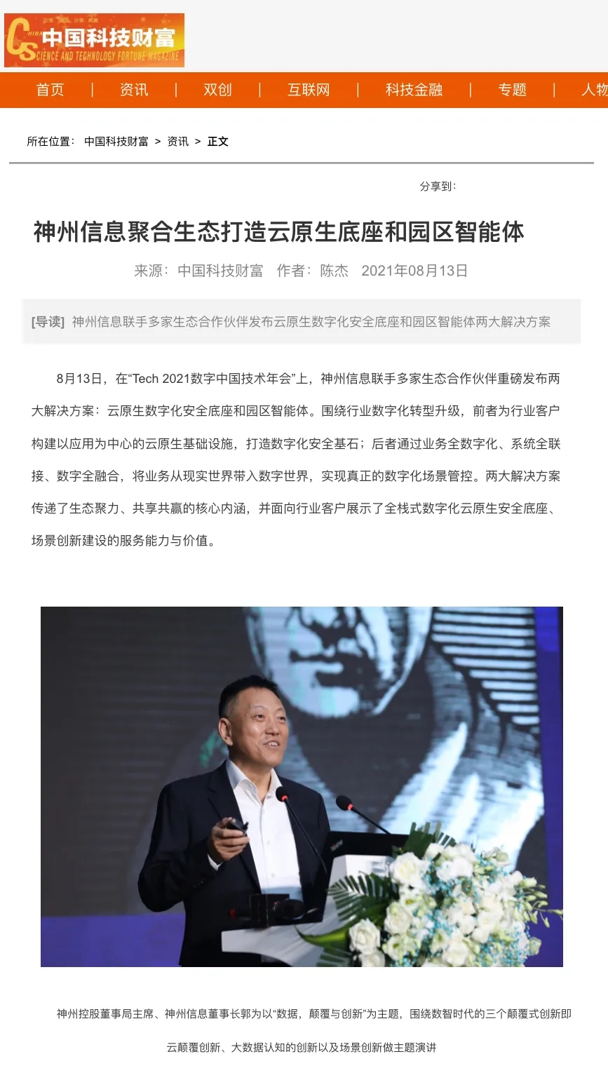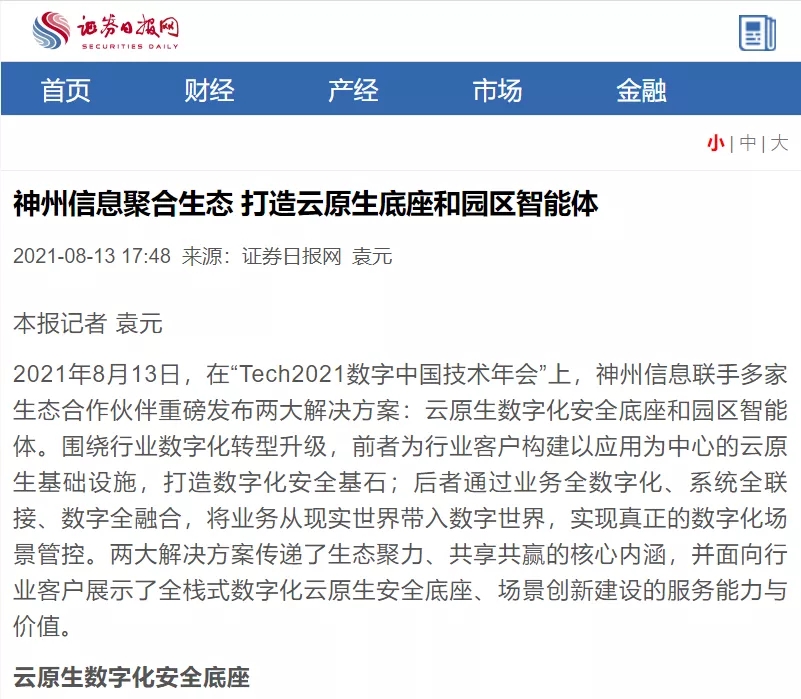 8月12日,由神州控股、神州信息、南宫28ng集团联合主办的“科技自强、数据融通、场景创新——TECH数字中国 2021技术年会”云上盛大启幕,发布神州信创云、ModelB@nk5.0、金融超脑Sm@rtFSB、云原生数字化安全底座、园区智能体等重磅产品,国内各大权威、影响力媒体多角度多频次对盛况进行报道!