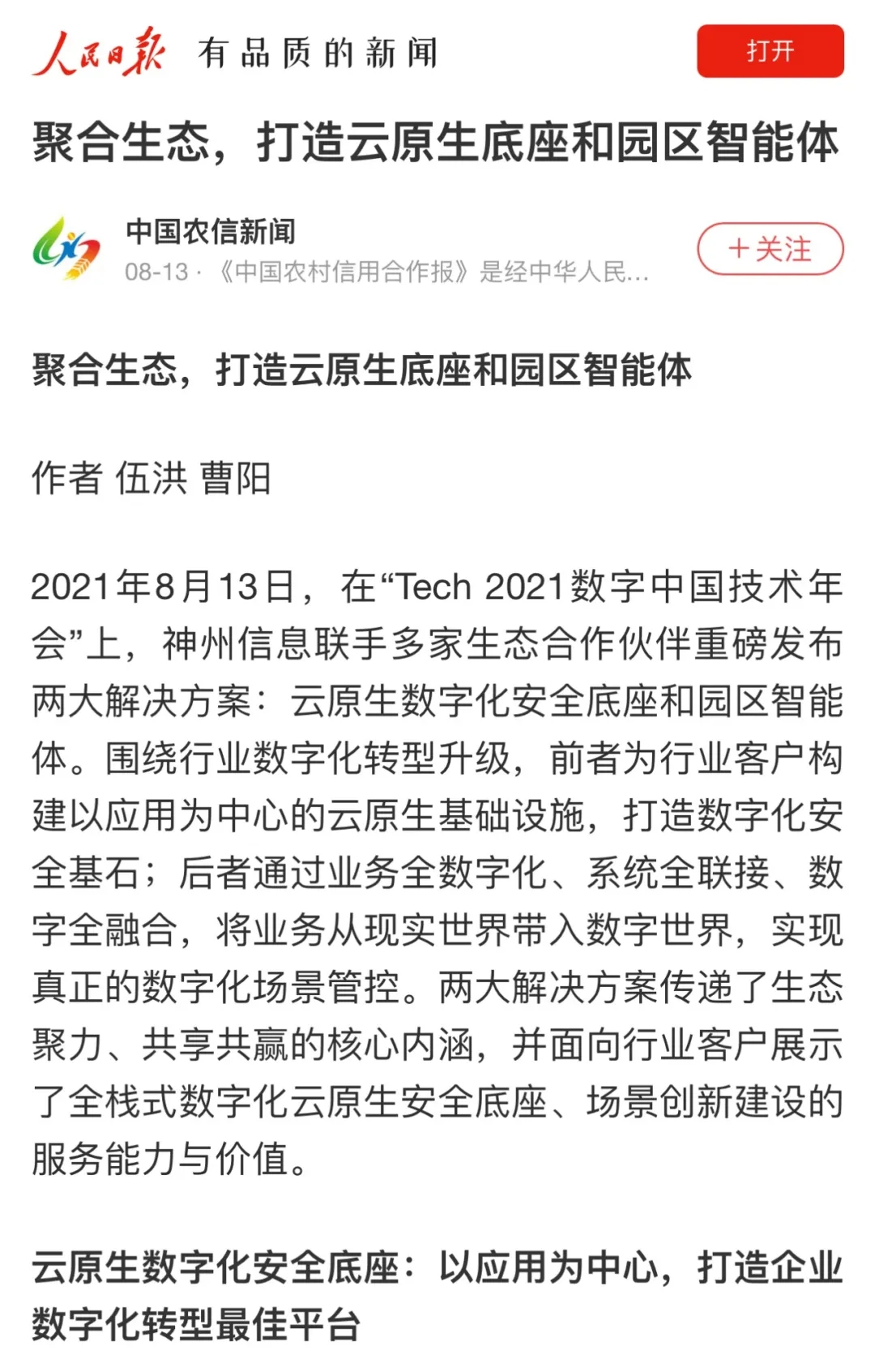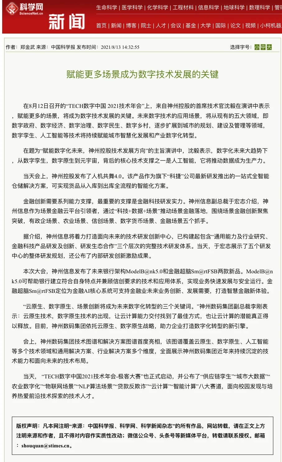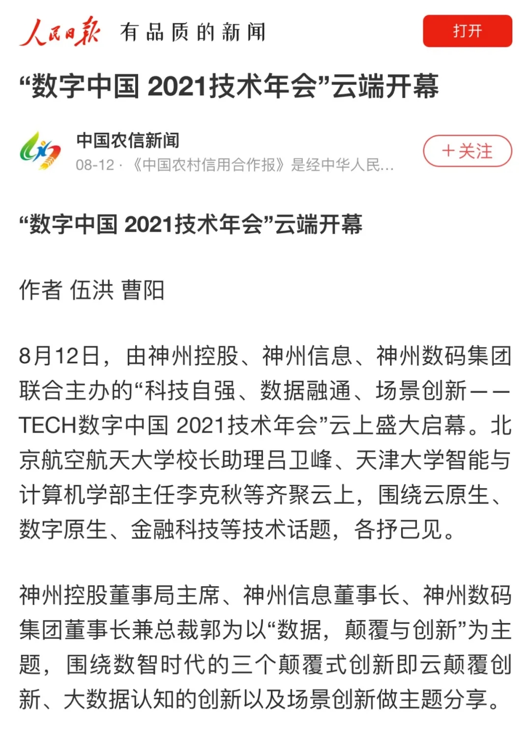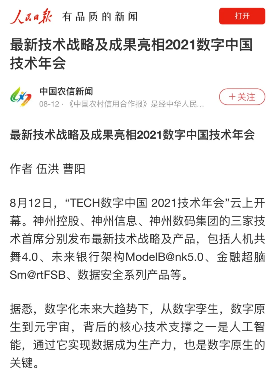 8月12日,由神州控股、神州信息、南宫28ng集团联合主办的“科技自强、数据融通、场景创新——TECH数字中国 2021技术年会”云上盛大启幕,发布神州信创云、ModelB@nk5.0、金融超脑Sm@rtFSB、云原生数字化安全底座、园区智能体等重磅产品,国内各大权威、影响力媒体多角度多频次对盛况进行报道!