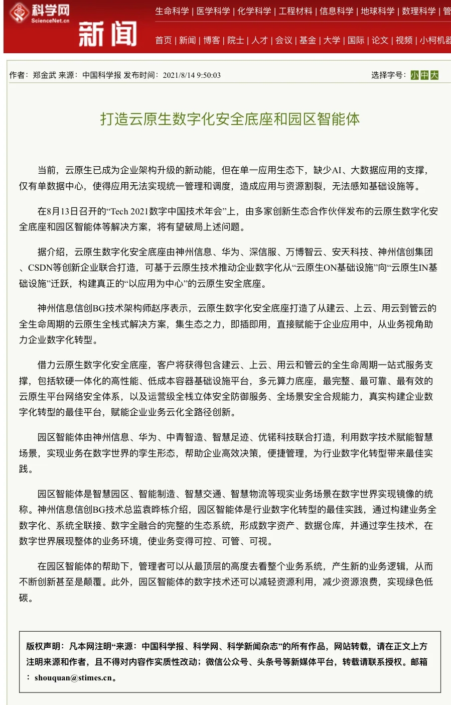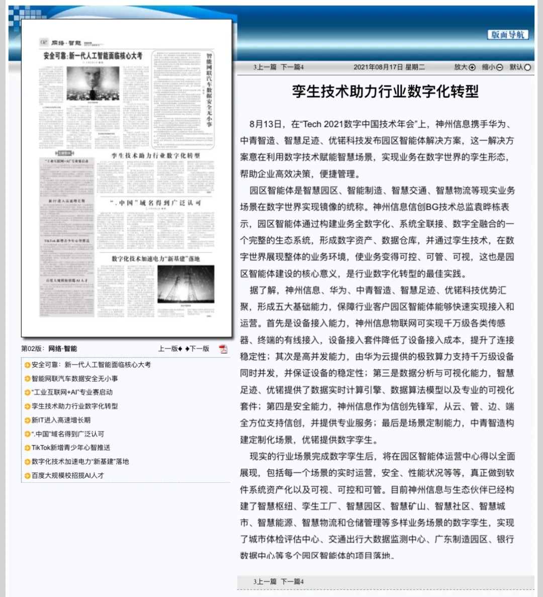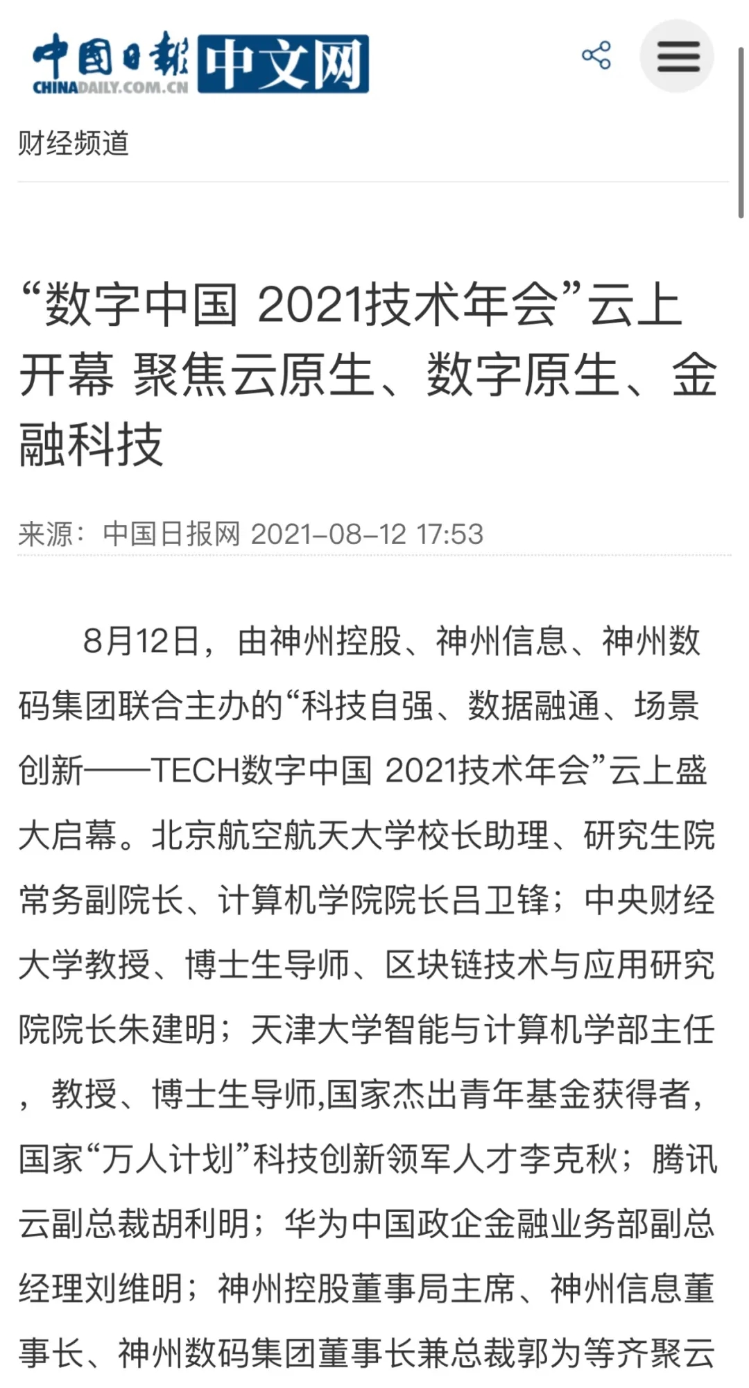 8月12日,由神州控股、神州信息、南宫28ng集团联合主办的“科技自强、数据融通、场景创新——TECH数字中国 2021技术年会”云上盛大启幕,发布神州信创云、ModelB@nk5.0、金融超脑Sm@rtFSB、云原生数字化安全底座、园区智能体等重磅产品,国内各大权威、影响力媒体多角度多频次对盛况进行报道!